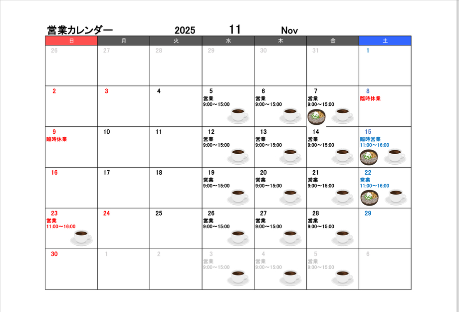 11月の営業予定一覧
