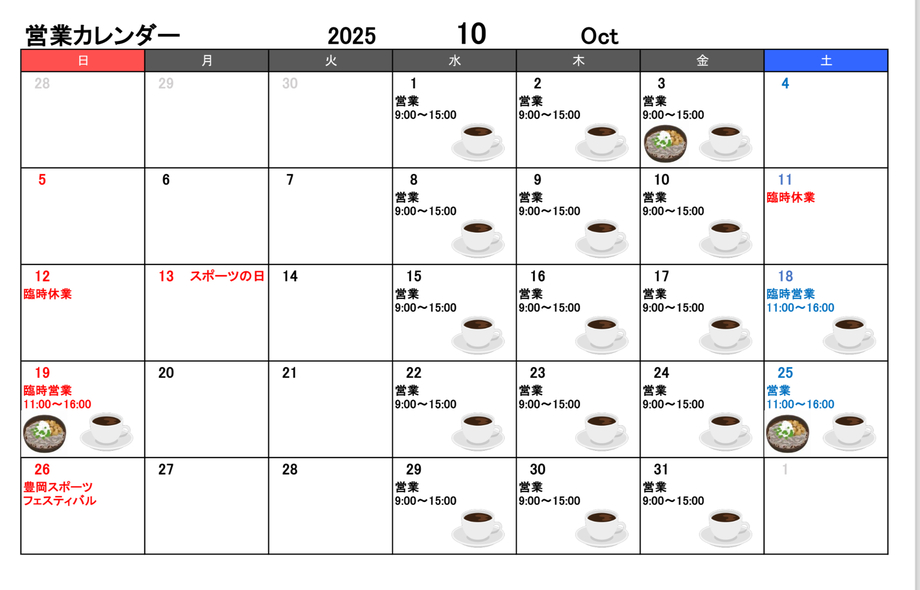 10月の営業予定一覧 ※臨時休業、臨時営業あり